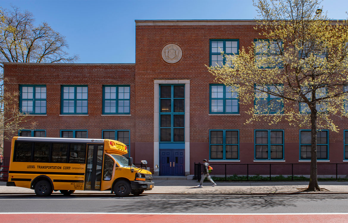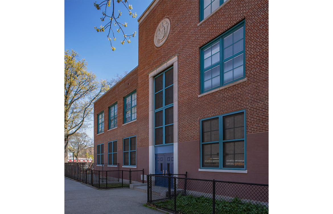PS 269 in Brooklyn is an Art Deco-inspired facility originally constructed in 1950, with architectural elements that honor its influence including continuous vertical bays at entrances and fire stairs, limestone surrounds, and brick walls stripped of ornament.