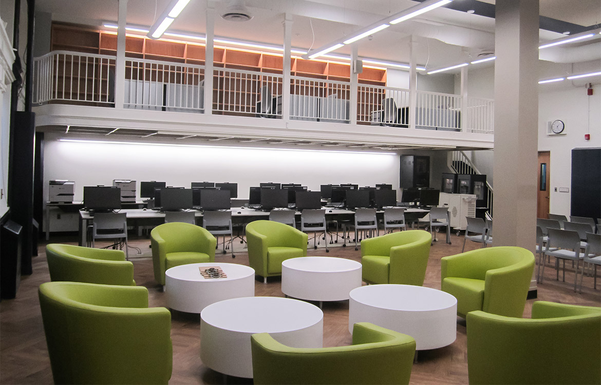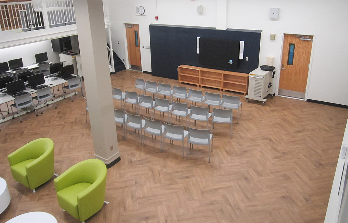 The $1.1 million design called for flexibility, with areas designated for meetings, lectures, computer graphic stations, conference rooms, a teacher work station and a student counseling area. Technology was upgraded to ensure adequate data for 30 computer work stations and a sound system, integrated with new smart boards.