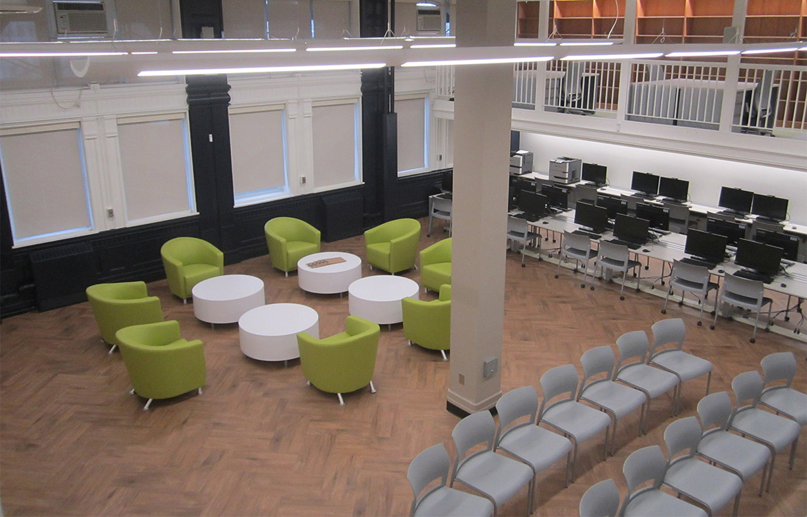 DMR designed an interior renovation to the library at PS 458 in Brooklyn, transforming the 2,300 SF space into a multimedia room. Two mezzanine levels, which were to be examined for removal as part of the project, were maintained through DMR’s design of a two-story, open educational environment.