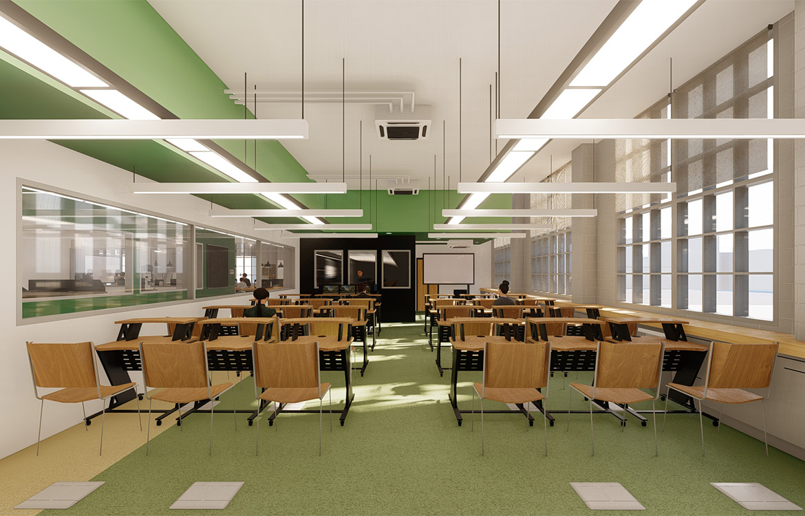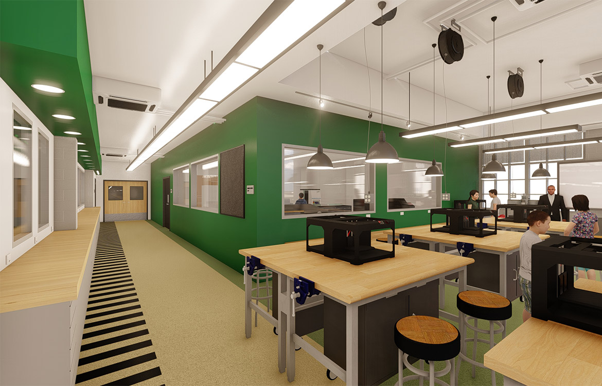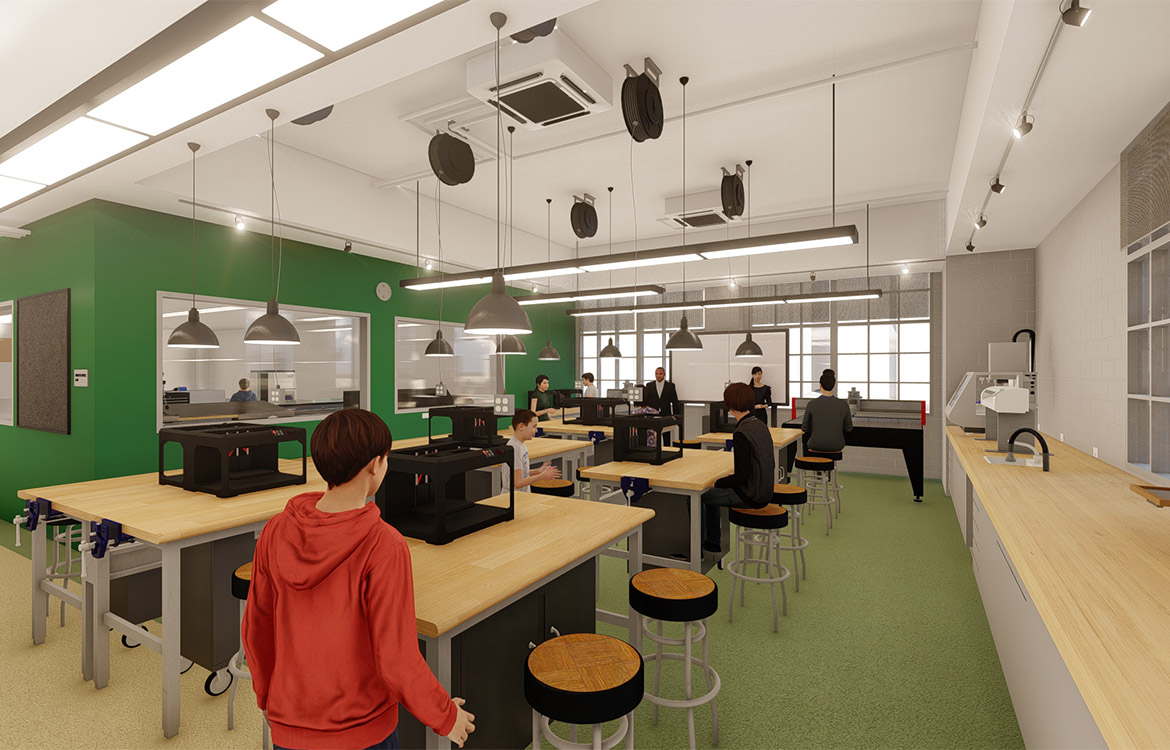 At PS 600, Ralph McKee High School, in Staten Island, DMR designed a renovation to an oversized and underutilized machine shop to allow for space for an expansion in curriculum that would add audio engineering and makerspace labs.