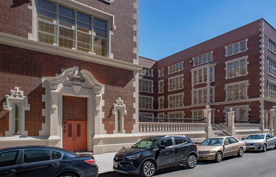 The first project was to eliminate water infiltration at the basement and upper floors, exterior walls, and roof which had caused severe throughout the majority of the school’s occupied spaces. The elevated plaza at the main entrance was also deteriorated, requiring the removal and reconstruction of the plaza deck and adding an ADA ramp connecting the plaza to the public sidewalk. The plaza work was a complex undertaking as two, existing 10,000-gallon underground oil tanks beneath the plaza needed to remain undisturbed and protected through construction.